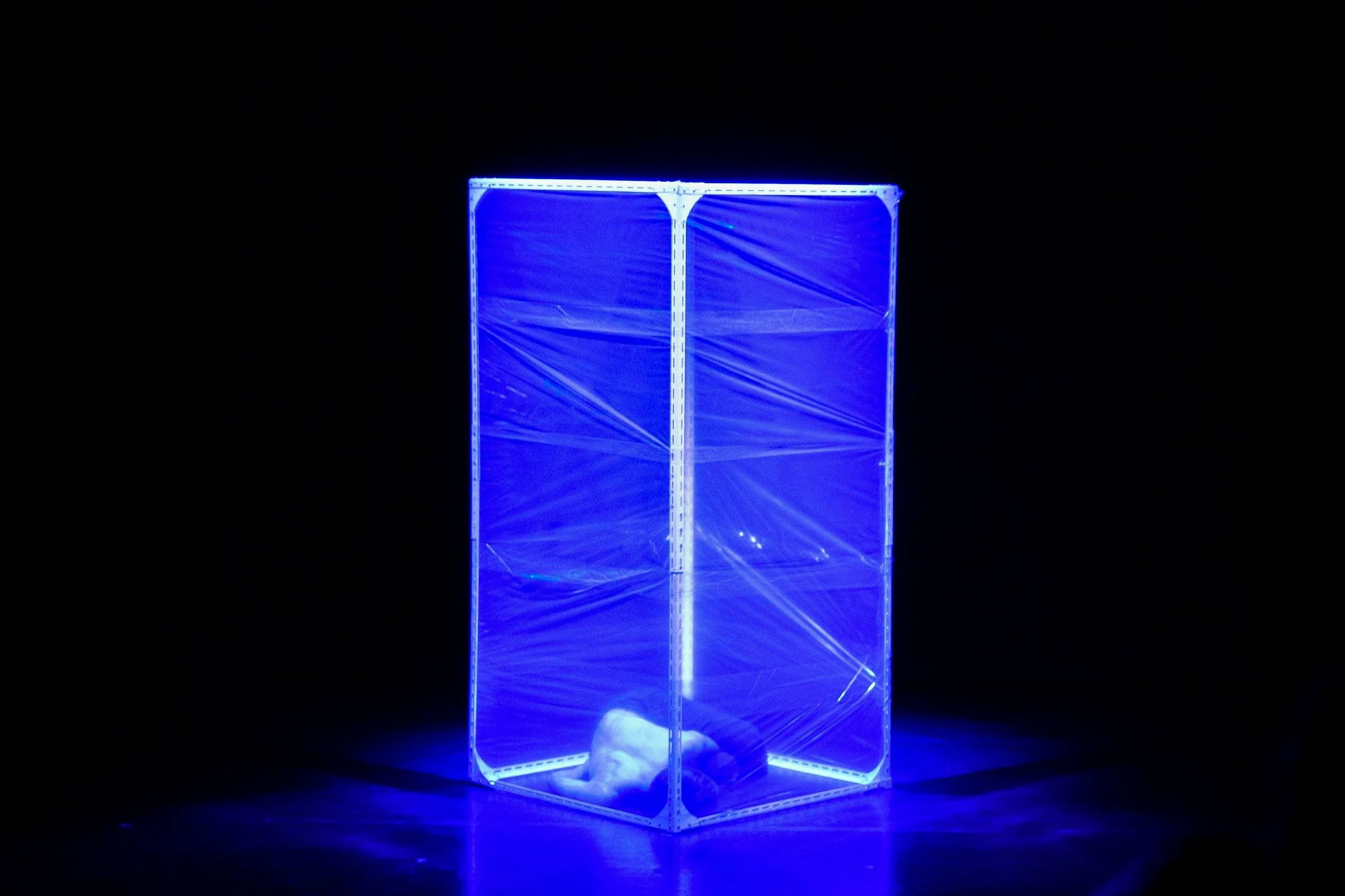 It begins with a translucent rectangular prism, tinged blue by the lights. Inside, there is a dancer curled up into himself. I don’t realise he’s there for several minutes. Not until he begins to move.